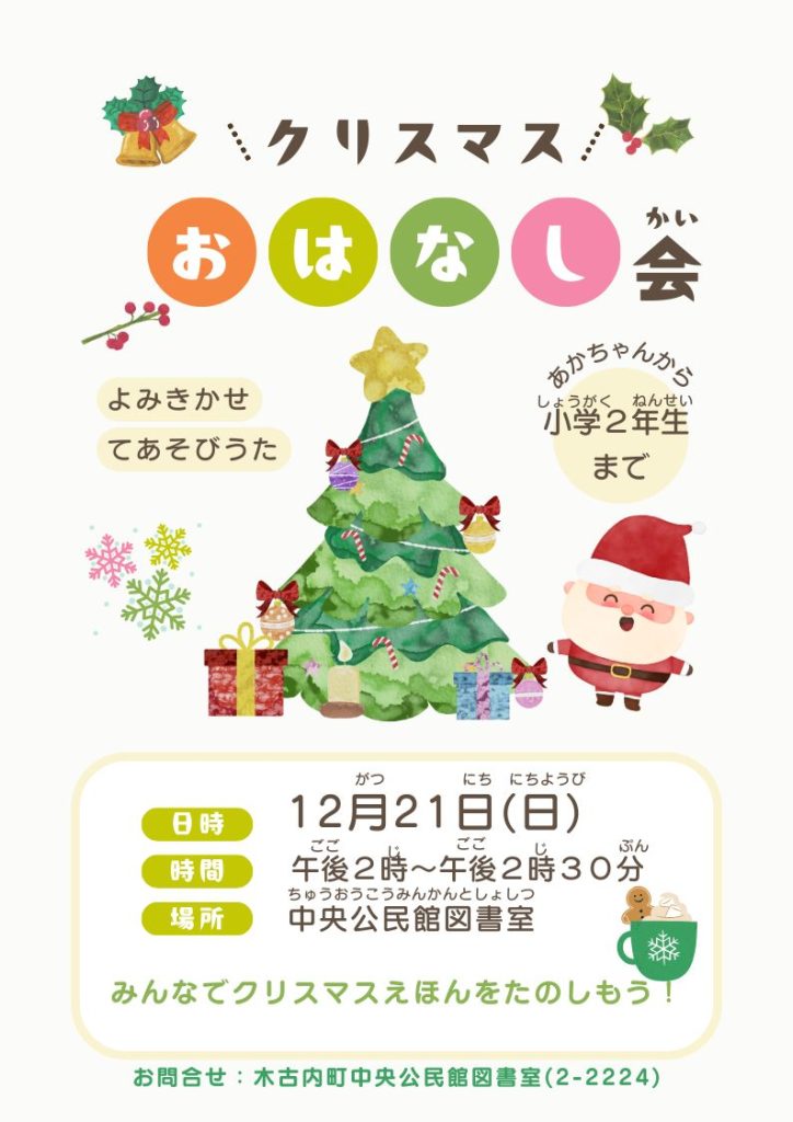 12月21日(日)にこどもの図書室講座として、クリスマス絵本の読み聞かせを行います。