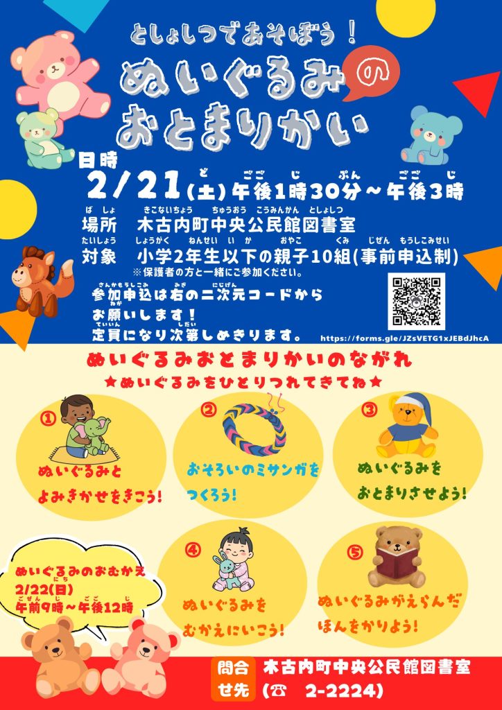 (2/21開催 )図書室で遊ぼう!ぬいぐるみのおとまり会実施のお知らせ